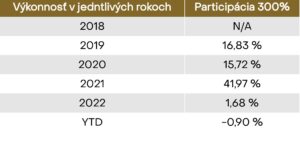 Index Leonteq Long/Short Absolute Return, ktorý v sebe zahŕňa predmetnú stratégiu, bol založený na konci roku 2018 a po započítaní participácie často siahal na dvojciferné výnosy. Aj napriek tomu, že rok 2022 bol extrémne stratový pre akcie a dlhopisy, index si zachoval kladné zhodnotenie. To je presne ten cieľ stratégií s absolútnym výnosom. Snaha dosahovať zisky za „každého počasia“. V roku 2021, keď sa trhom darilo a akcie siahali na 20 %-né zhodnotenie, index absolútneho výnosu exceloval a zaknihoval viac ako 40 %-né zhodnotenie v danom roku po započítaní participácie.